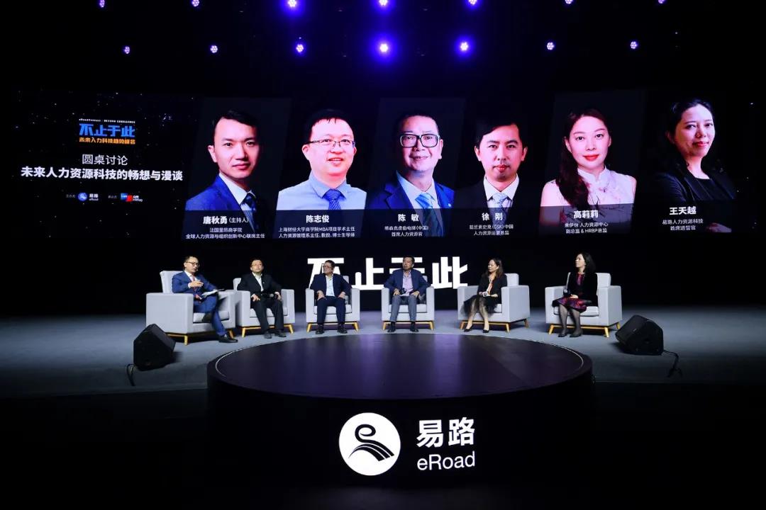 圆桌讨论:从左至右依次是法国里昂商学院全球人力资源与组织创新研究中心联席主任唐秋勇先生、上海财经大学商学院MBA项目学术主任、人力资源管理系主任、教授、博士生导师陈志俊先生、蒂森克虏伯电梯(中国)首席人力资源官陈敏先生、葛兰素史克中国人力资源运营总监徐刚先生、来伊份人力资源总监&HRBP总监高莉莉女士、易路人力资源科技首席运营官王天越女士;